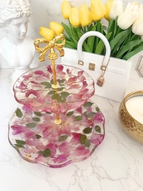 This exquisite handmade two-tier cake stand transforms your dried wedding flowers or petals into a stunning keepsake, encased in crystal-clear resin and finished with sophisticated gold or silver fittings. Perfect for showcasing cakes—or styled with perfumes, jewellery, candles, or treasured mementos—this versatile piece turns everyday displays into a lasting celebration of your special day.