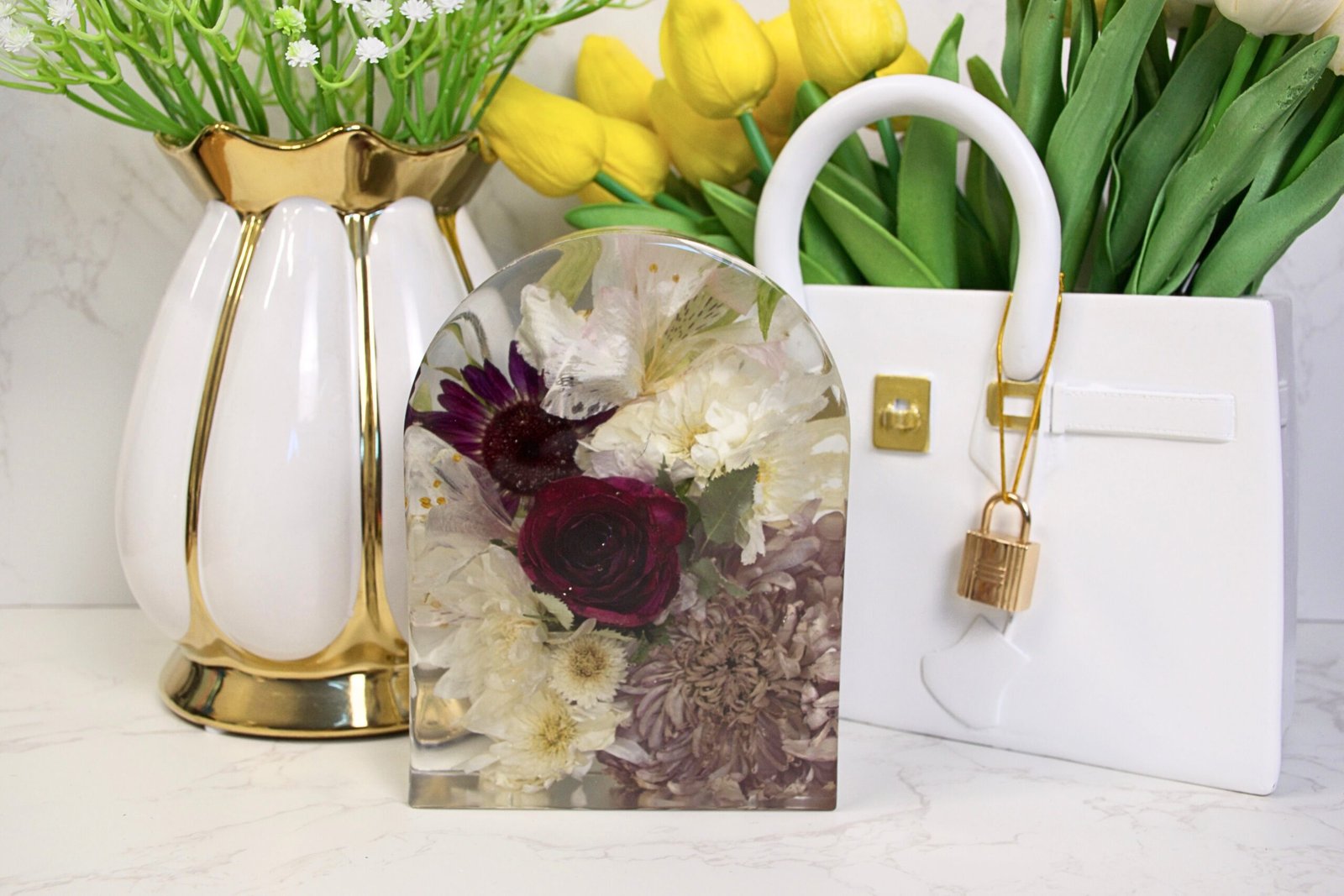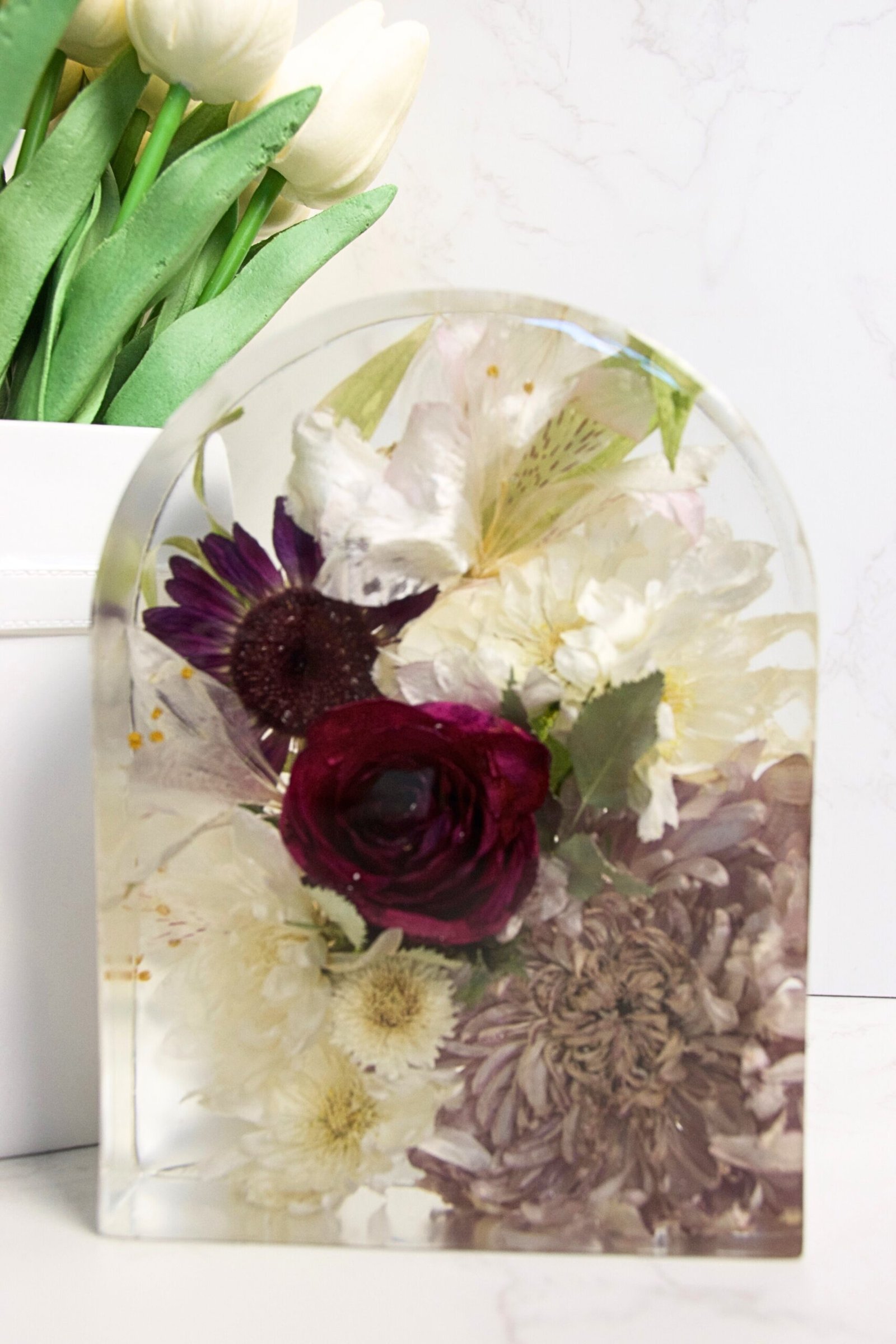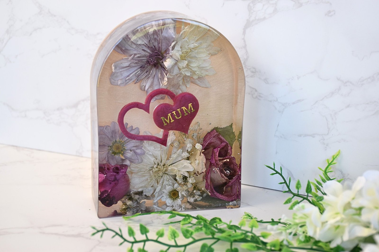 Our beloved Large Resin Arch block are stunning statement pieces, perfect for displaying your bouquet, special occasion, or memorial flowers. Available in three versatile sizes, they beautifully showcase flowers and foliage of every shape and size, turning your cherished blooms into a centrepiece that truly captivates. Personalisation brings a unique and heartfelt touch to the keepsake.