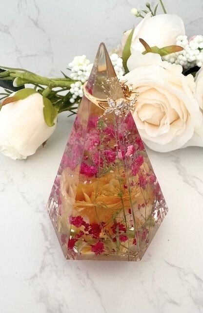 Simply a must have for every Bride! Keep your memories close with this Large Geometric Resin Ring Holder. Real flowers are preserved in crystal-clear resin, creating a stunning keepsake—perfect for petals and small blooms from your wedding bouquet.