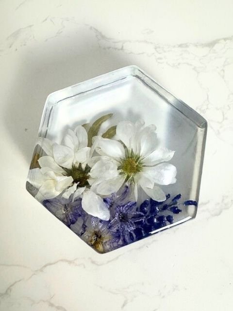 Our Resin Hexagon Paperweight is the perfect luxury gift for family and friends. Its beautifully compact size showcases 2–3 delicate blooms, creating an elegant keepsake that looks stunning displayed anywhere in the home. A thoughtful way to share the memories of your special